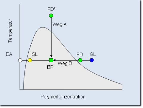 Schematisches Phasendiagramm eines binären Systems bestehend aus einem Polymer und einem Lösungsmittel. Die Mischungslücke ist schattiert. In der Abbildung wird gezeigt, wie der Betriebspunkt (BP) entweder durch Abkühlung einer homogenen Feed-Lösung (FD*, Weg A) oder durch Zugabe von Lösungsmittel (Extraktionsagens, EA) zu einer konzentrierten Feed-Lösung (FD, Weg B) erreicht werden kann. Das System entmischt in eine polymerreiche Gel-Phase (GL) und eine polymerarme Sol-Phase (SL).